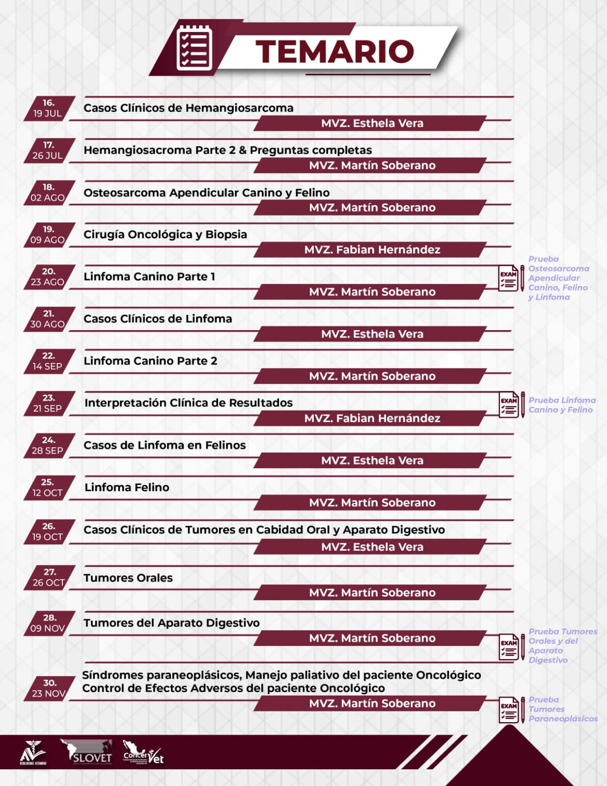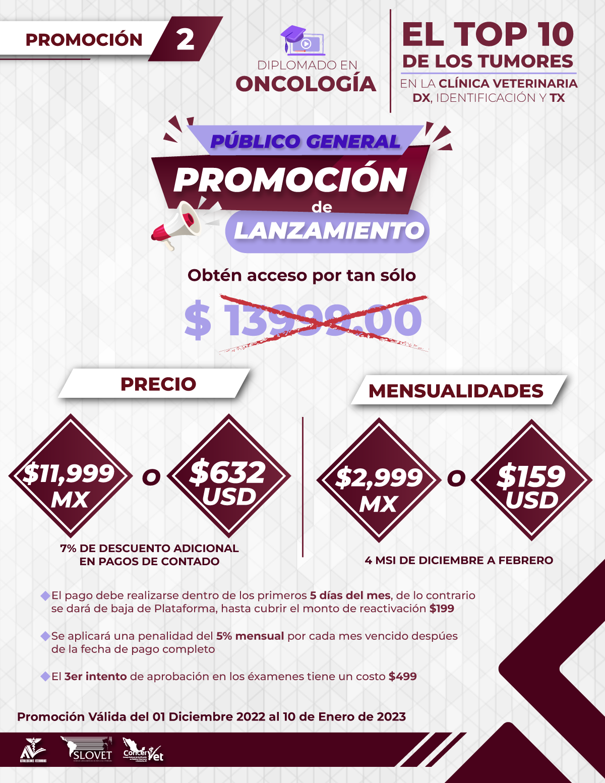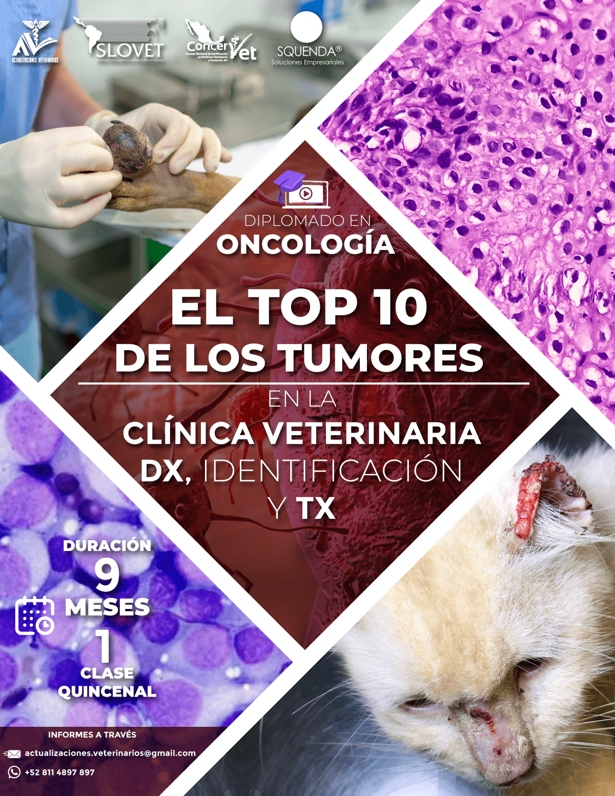 • Que el MVZ. Pueda hacer un correcto diagnóstico, identificación y sobre todo esquema de tratamiento y prevención sobre diversas patologías Oncológicas que se desarrollan en la clínica diaria de pequeñas especies